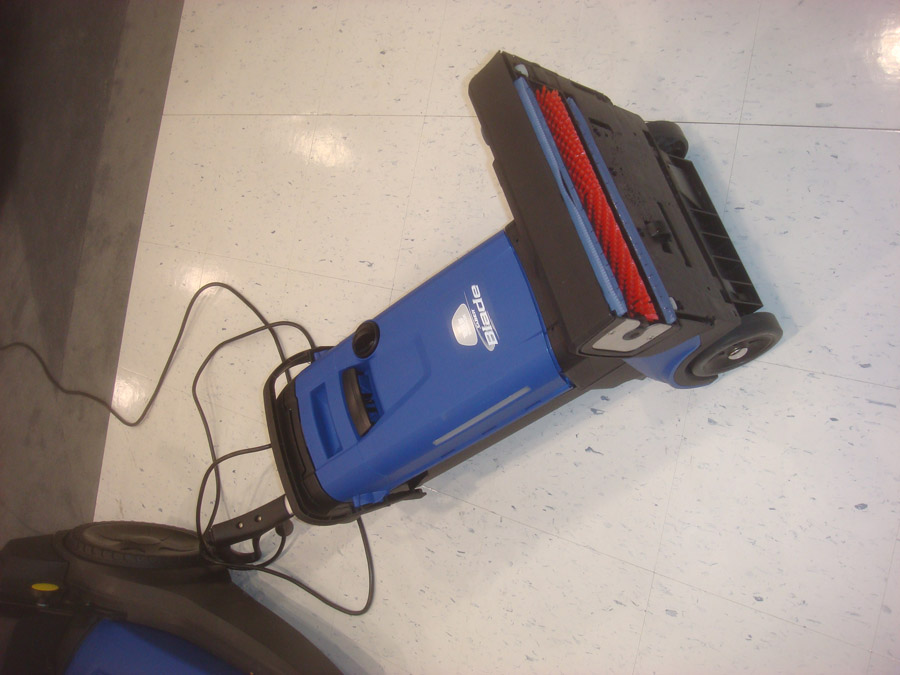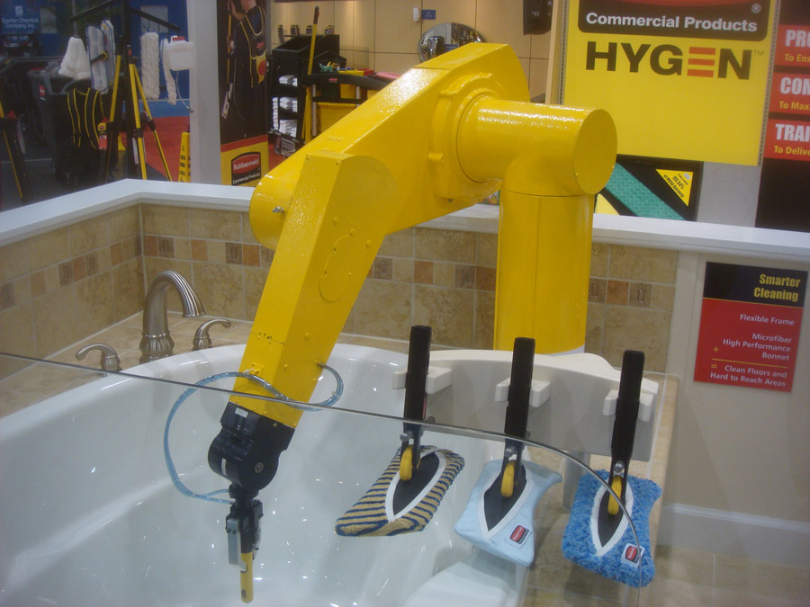 1881: Rubbermaid Restroom Cleaning Robot Demos Micro Fiber Cleaning Pads.